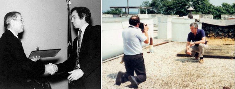 Frank Snepp nhận Huy chương của CIA năm 1975, từ Giám đốc CIA William E. Colby (trái). Một nhân viên của BBC quay phim Snepp năm 1991 trên nóc Đại sứ quán Hoa Kỳ tại Sài Gòn cho một cuốn phim tài liệu (phải).