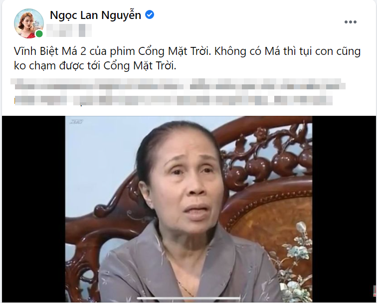 Diễn viên Ngọc Lan cũng buồn bã và chia sẻ hình ảnh trong phim của cố nghệ sĩ. Nữ diễn viên viết: "Tạm biệt má của phim Cổng mặt trời, không có má thì tụi con cũng không chạm được đến phim". (Ảnh: Chụp màn hình)