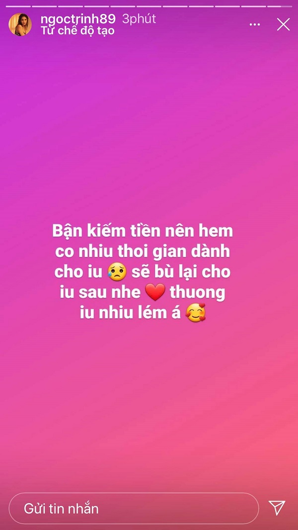 Theo dõi dòng trạng thái của Ngọc Trinh cùng những động thái thời gian gần đây, dân mạng cho rằng người "iu" mẫu nội y nhắc tới ở đây chính là nam đạo diễn 59 tuổi. Tuy nhiên, đây không phải tình yêu trai gái mà chính là tình yêu cha con, sự kính trọng.