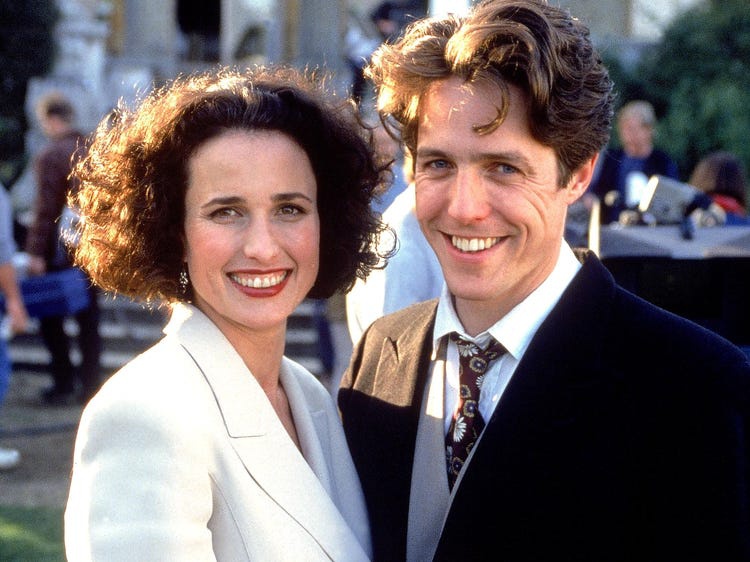 Four Weddings And A Funeral thu về 245,7 triệu USD - con số không tưởng lúc bấy giờ, đồng thời giúp tên tuổi Grant và MacDowell nổi khắp thế giới. Về sau, các tác phẩm của Grant như Mickey Blue Eyes (1999), Notting Hill (1999)... cũng đạt thành công vượt mong đợi. Tới đầu thập niên 2000, tài tử được mệnh danh là "vua của dòng phim tâm lý tình cảm pha chất hài". Ảnh: Insider.