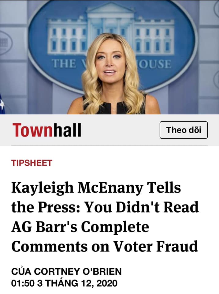 Xin thêm cuộc họp báo hôm qua ngày 2/11/2020 của cô Kayleigh McEnany đã chứng tỏ cho truyền thông thấy rõ bộ mặt giả dối đạo đức giả của các lãnh đạo đảng Dân Chủ. Nếu truyền thông tôn trọng sự thật thì họ cũng phải xấu hổ vì họ bênh vực cho lãnh tụ đảng Dân Chủ một cách quá đáng. Dĩ nhiên trong cuộc họp báo này truyền thông đã làm ngơ những gì mà cô phụ trách truyền thông cho Toà Bạch Ốc đưa ra.