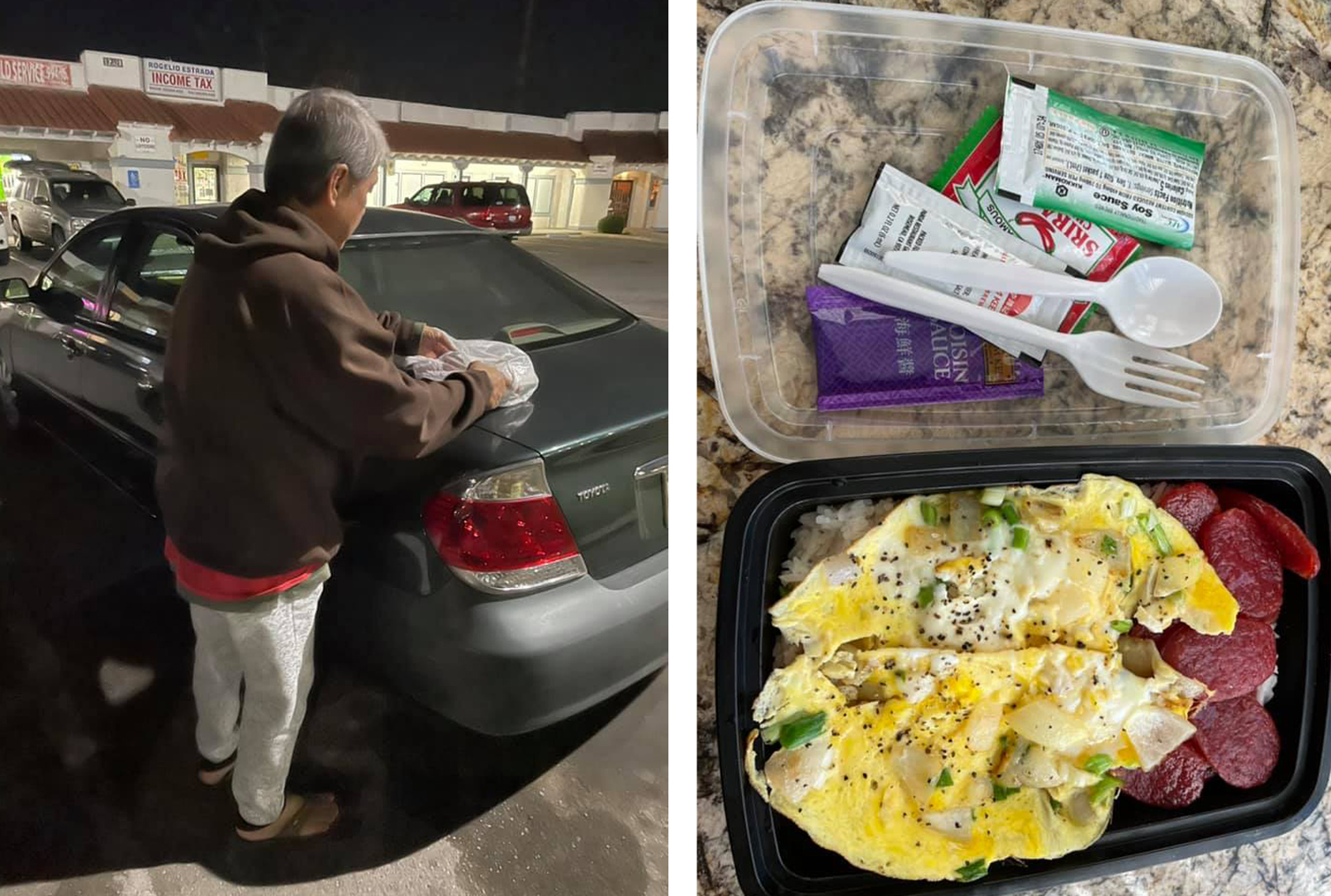Ngày 28 Tháng Mười Một, trên trang facebook “Người Việt Cali,” một thành viên tên Vang David, viết: “Hôm nay t́nh cờ gặp được chú này… năm nay 60 tuổi bị thất nghiệp lúc COVID-19 và bị chủ nhà đuổi và phải sống trong xe. Đứng tâm sự nghe chú nói sáu tháng rồi chú chưa được ăn cơm và chú hỏi ḿnh có thể cho chú đĩa cơm trứng với lạp xưởng. Ḿnh nói để đi mua cho chú Chinese food Togo th́ chú nói không thích… Thích cơm nhà v́ lâu rồi chú không được ăn. Vậy là ḿnh về ra tay món dễ nhất. Chú ăn xong cám ơn vui vẻ và không hề xin tiền. Chú cứ nói tới Tháng Mười Hai có thuốc ngừa, là ông chủ sẽ kêu làm lại. Chú ở ngay góc đường Carson và Belshire của thành phố Lakewood. Ai có đi ngang th́ có ǵ cho chú đấy… Hy vọng chú có lại việc làm. Tuy chú ở ngoài đường nhưng rất sạch sẽ và có tự trọng lắm… không làm phiền ai nhưng ngại tiếp xúc…”