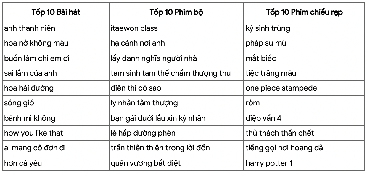 Ngoài ra danh sách xu hướng tìm kiếm nổi bật Việt Nam 2020 dựa trên xu hướng tìm kiếm các từ khóa và chủ đề trên Google với 15 hạng mục, bao gồm 3 hạng mục đáng chú ý thuộc lĩnh vực văn hóa giải trí là: Top 10 Phim bộ, Top 10 Phim chiếu rạp, và Top 10 Âm nhạc.