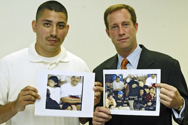 Juan Catalan (trái) và luật sư cầm khung hình có xuất hiện hai cha con Juan ở trận bóng. Ảnh: Life Daily.