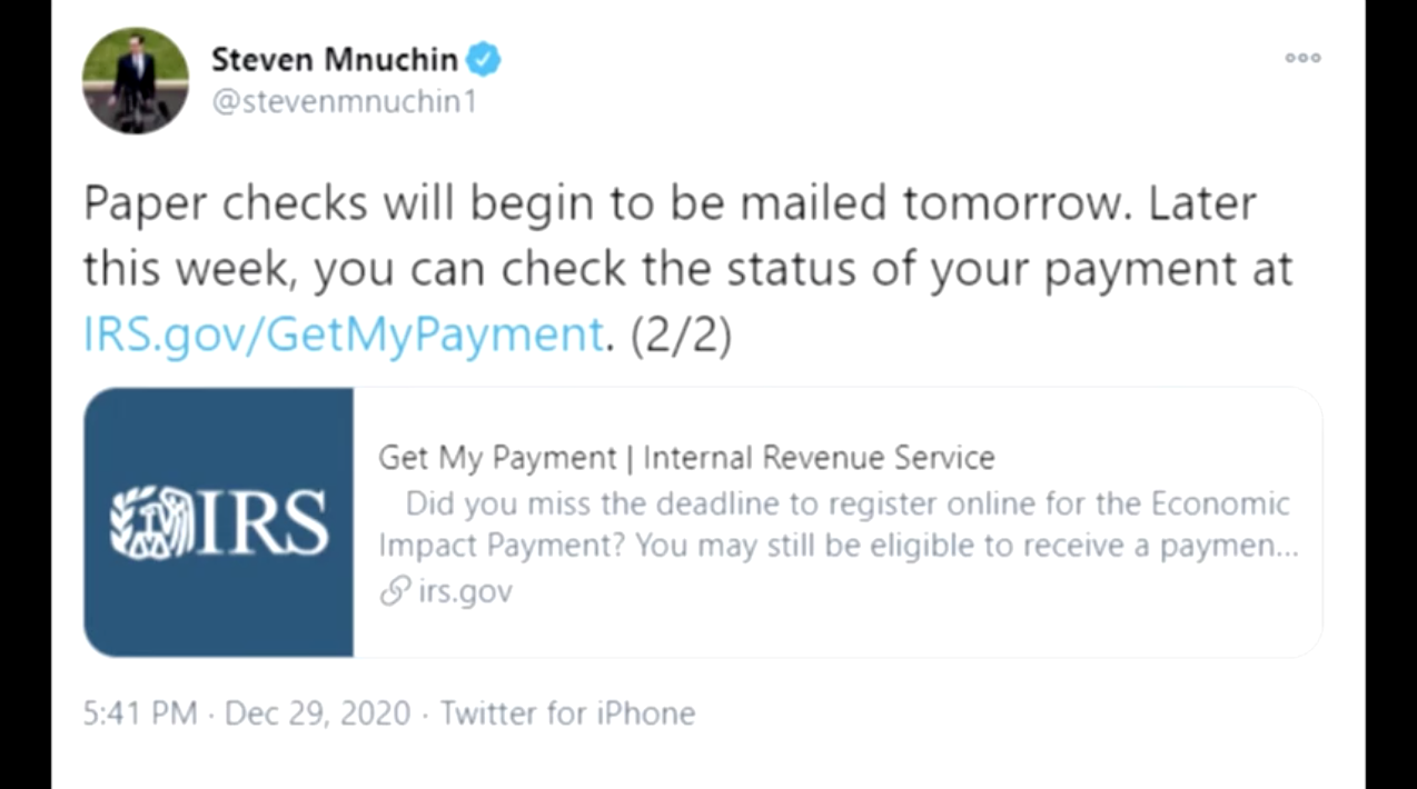 Tuần trước, ông Mnuchin nói với CNBC rằng những người Mỹ đủ điều kiện nhận tiền có thể nhận được tiền trong tài khoản ngân hàng sau vài ngày. Sự chậm trễ của Tổng thống Trump trong việc ký gói viện trợ khi ông chỉ trích quy mô của số tiền thanh toán là quá ít và các khoản viện trợ ngoại quốc có trong dự luật tài trợ cuối năm cho chính phủ kèm theo đã làm dấy lên lo ngại rằng người dân sẽ nhận được tiền muộn hơn. Dự luật, được Tổng thống Trump ký vào tối ngày Chủ nhật (ngày 27 tháng 12), cũng gia hạn các khoản trợ cấp thất nghiệp chính và phân bổ thêm kinh phí cho các doanh nghiệp nhỏ.