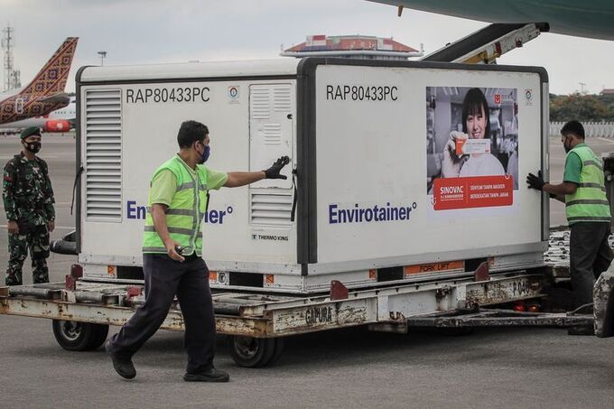 Nhân viên sân bay và binh sĩ Indonesia di chuyển các lô vaccine của Sinovac tại sân bay Soekarno-Hatta gần Jakarta hôm 12/1. Ảnh: Reuters.
