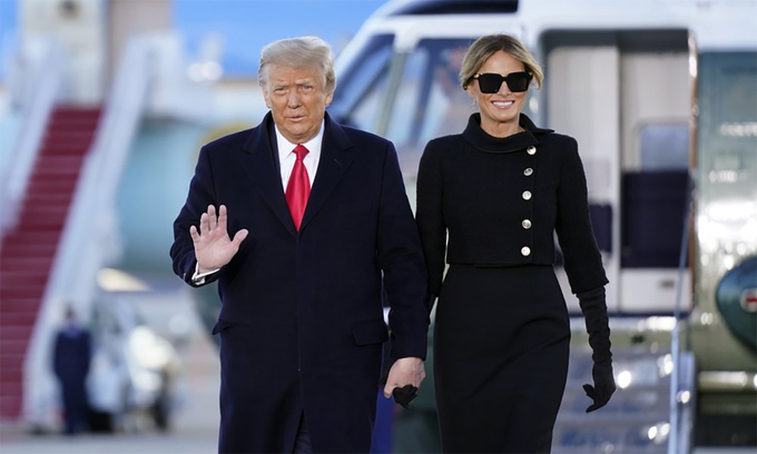 Cựu tổng thống Mỹ Donald Trump (trái) và phu nhân Melania Trump (phải) trước khi lên chuyên cơ Không lực Một tại căn cứ không quân Andrews, bang Maryland, ngày 20/1. Ảnh: AP.