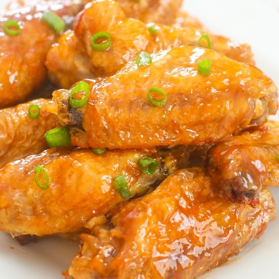 - Bày cánh gà ra đĩa, đổ nước sốt lên, rắc hành lá thái nhỏ.