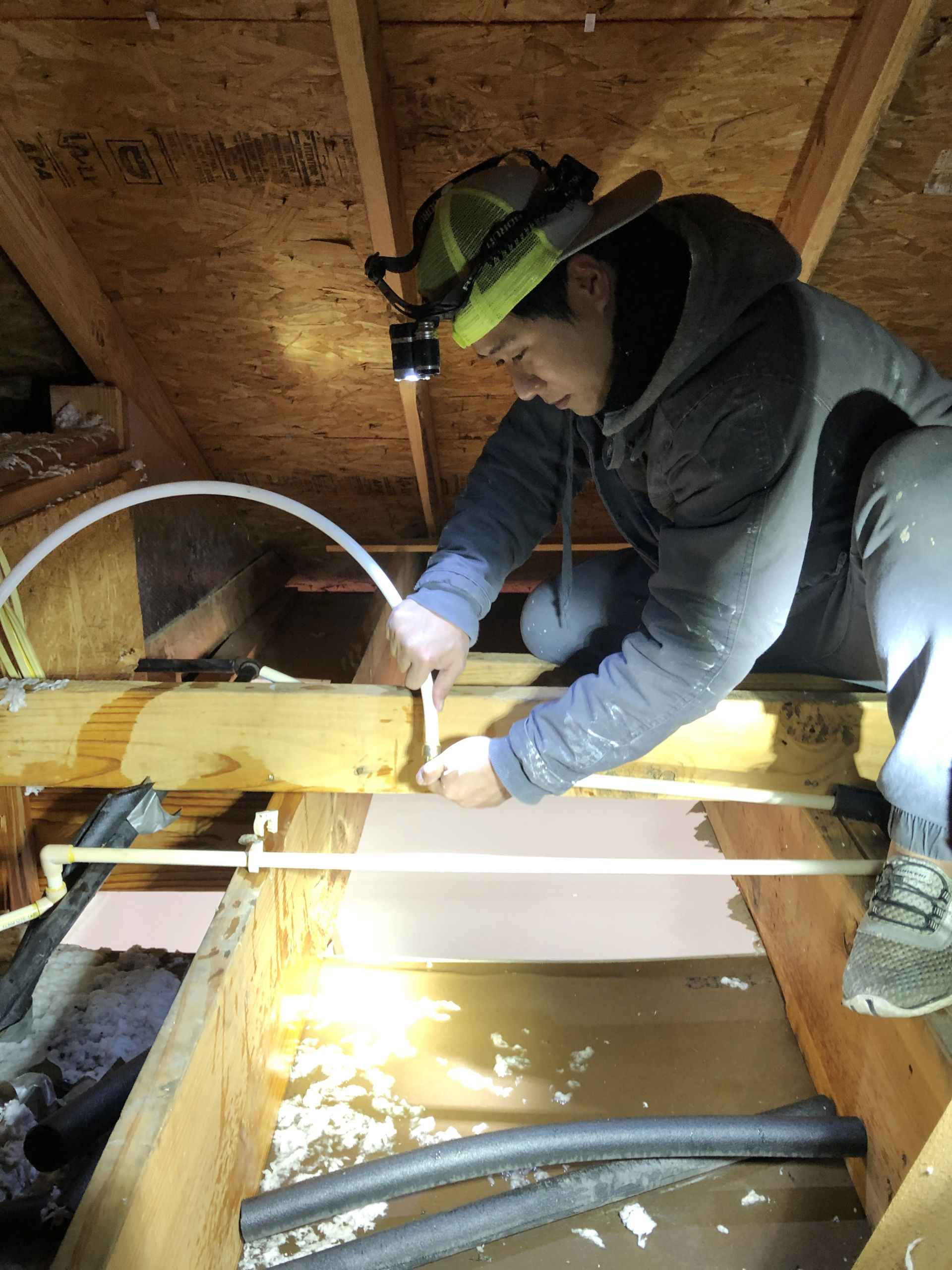 Một thành viên nhóm Hiệp Sĩ Houston giúp sửa ống nước cho gia đình đồng hương. (Hình: Hiệp Sĩ Houston cung cấp)