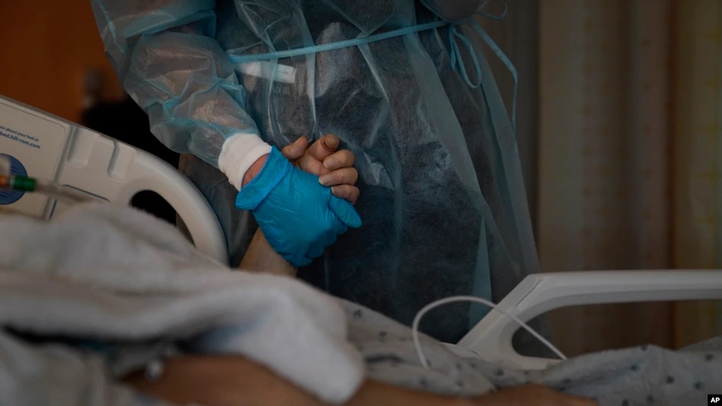 Một linh mục nắm tay một bệnh nhân Covid-19 vừa qua đời trong khi nói chuyện với thân nhân người mất qua điện thoại ở bệnh viện Providence Holy Corss ở Los Angeles