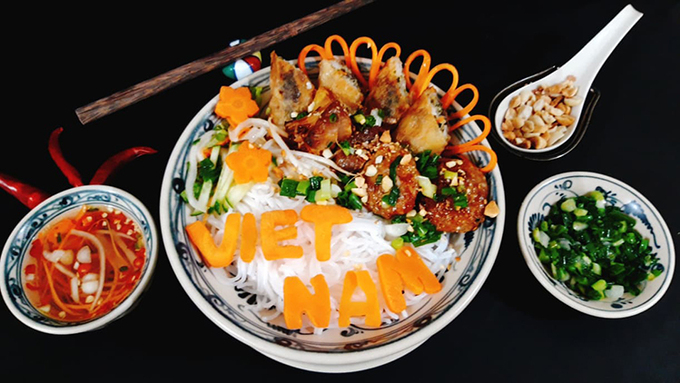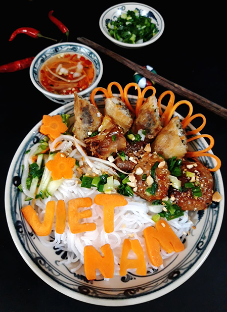 e) Trình bày và thưởng thức: Trong một bát tô (nếu có bát chiết yêu là đẹp nhất vì miệng loe phô diễn vẻ đẹp các nguyên liệu), lần lượt cho bún, rau sống, xà lách cắt nhỏ, dưa leo, đồ chua, thịt nướng, chả giò, đậu phộng rang giã dập, dầu hành lá (hoặc hành phi). Khi ăn, rưới thêm nước mắm chua ngọt, trộn đều và thưởng thức.