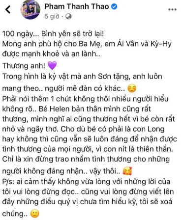 Cô đăng bài nghi ngờ danh phận thật sự của bé Helen trong bài viết. "Bé Helen bản thân mình cũng rất thương, mình nghĩ ai cũng thương hết vì bé còn rất nhỏ và ngây thơ. Cho dù bé có phải con anh Long hay không thì cũng vẫn sẽ luôn đáng để nhận được tình thương của mọi người. Chỉ là xin đừng trao nhầm tình thương cho những người không đáng nhận, vậy thôi", Phạm Thanh Thảo viết.