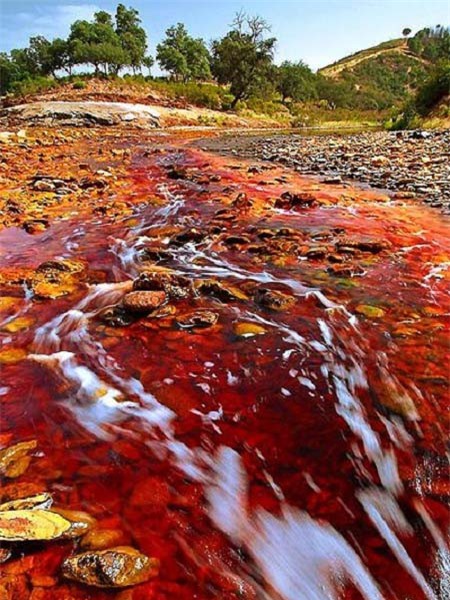 Dòng sông đỏ như máu siêu lạ ở Tây Ban Nha. Đó là dòng sông Rio Tinto. Nó bắt nguồn từ vùng núi Sierra Morena, chảy về vùng vịnh Gulf được xem là nguồn quặng đồng, sắt lớn nhất thế giới.