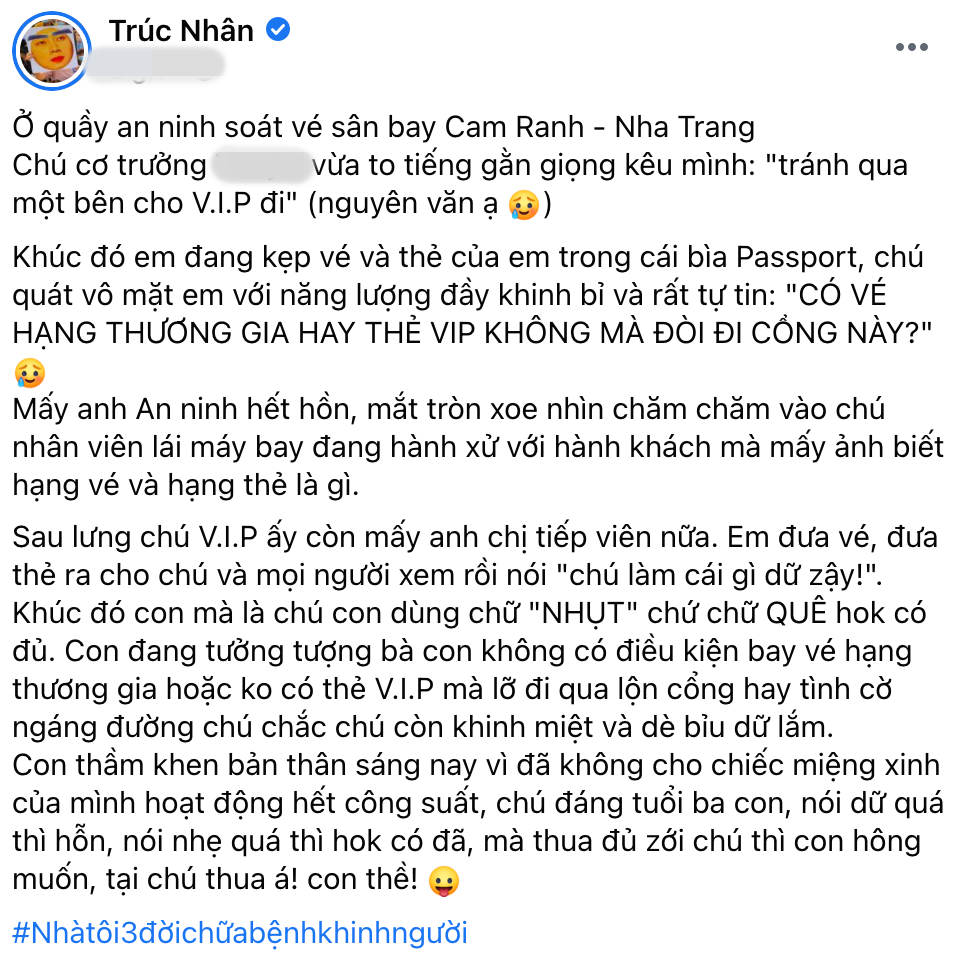 Trúc Nhân chia sẻ: “Chú cơ trưởng to tiếng gằn giọng kêu mình: 'Tránh qua một bên cho V.I.P đi'. Khúc đó, em đang kẹp vé và thẻ của em trong cái bìa passport. Chú quát vô mặt em với năng lượng đầy khinh bỉ và rất tự tin: 'Có vé hạng thương gia hay thẻ VIP không mà đòi đi cổng này.