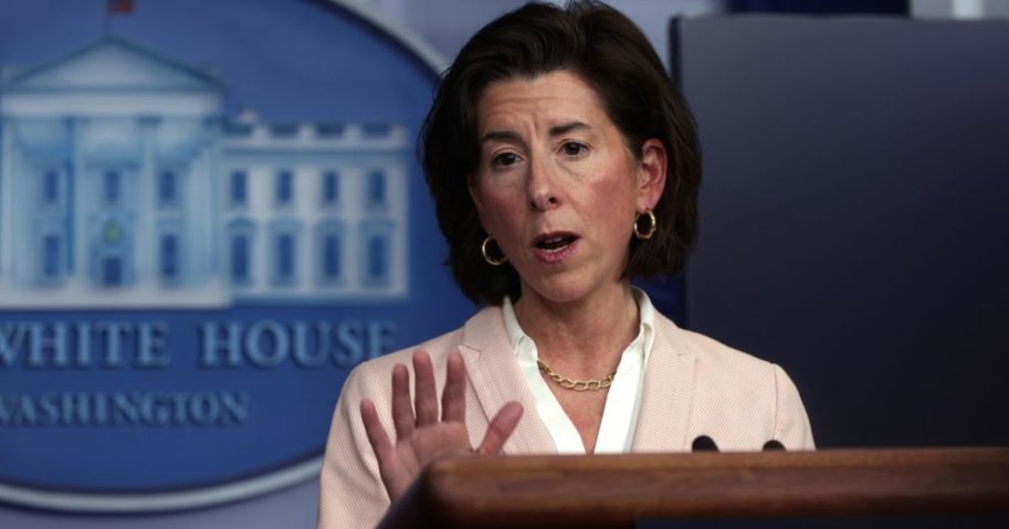 Bộ trưởng Thương mại Gina Raimondo trả lời một câu hỏi hôm thứ Tư trong cuộc họp báo về tin tức của Nhà Trắng. (Hình ảnh Alex Wong / Getty)