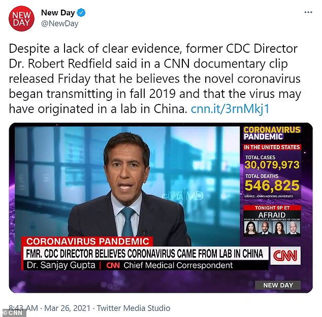 Phóng viên y tế trưởng của CNN, Tiến sĩ Sanjay Gupta hiện nói rằng ông tìm thấy lý thuyết của Tiến sĩ Redfield về nguồn gốc trốn thoát trong phòng thí nghiệm của COVID-19 'được thông báo' và 'khả năng xảy ra nhất'.