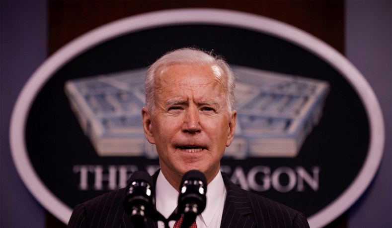 Tổng thống Joe Biden phát biểu trước các nhân viên Bộ Quốc phòng trong chuyến thăm Lầu Năm Góc ở Arlington, Va., Ngày 10 tháng 2 năm 2021. (Carlos Barria / Reuters)