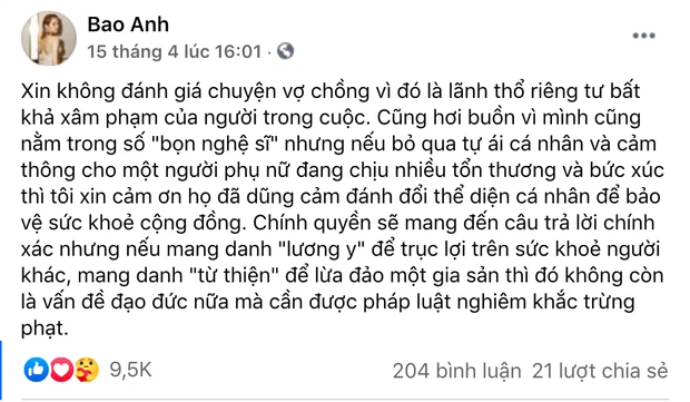 Ngày 15/4, Bảo Anh nêu quan điểm cá nhân khi bị xúc phạm là "đám nghệ sĩ"