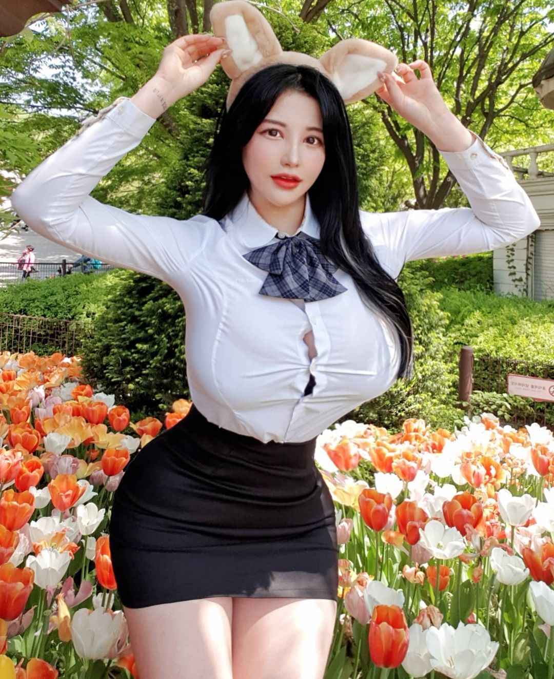 Khi mặc sơ mi, người ta thường tránh mặc áo quá chật, để lộ khoảng cách giữa các khuy áo nhưng người đẹp Hàn Quốc này lại cố tình mặc như vậy. Chẳng những vậy, cô còn mặc nội y màu đen tương phản với sắc trắng. Nhất là khi đây là đồng phục học sinh nên càng khó lòng được chấp nhận. Không thể phủ nhận vóc dáng "bom di động" của người đẹp nhưng sự gợi cảm này bị chê bai phản cảm vì quá đà.