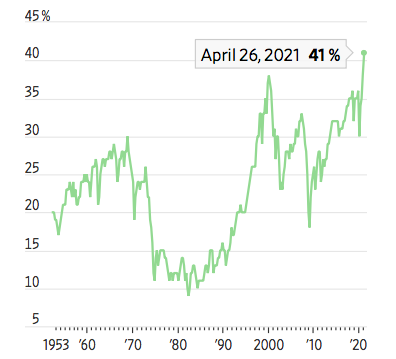 Tới tháng 4, hơn 40% tài sản tài chính của các hộ gia đình Mỹ được phân bổ vào cổ phiếu. Đây là mức kỷ lục số cổ phiếu người dân Mỹ nắm giữ từ trước tới nay.