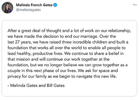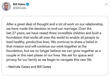 Người sáng lập Microsoft 65 tuổi và người vợ 56 tuổi của ông đã tuyên bố chia tay thông qua Twitter vào thứ Hai, cả hai đăng cùng một tuyên bố chung có nội dung: 'Sau rất nhiều suy nghĩ và rất nhiều công việc, chúng tôi đã thực hiện quyết định kết thúc cuộc hôn nhân của chúng tôi.