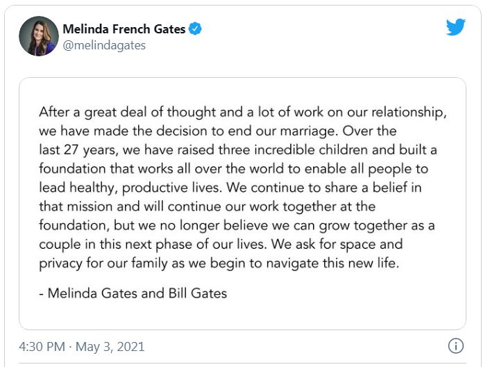 'Trong 27 năm qua, chúng tôi đã nuôi dạy ba đứa trẻ đáng kinh ngạc và xây dựng một nền tảng hoạt động trên toàn thế giới để giúp tất cả mọi người có cuộc sống lành mạnh và hiệu quả. Chúng tôi tiếp tục tin tưởng vào sứ mệnh đó và sẽ tiếp tục làm việc cùng nhau tại quỹ, nhưng chúng tôi không còn tin rằng chúng tôi có thể phát triển cùng nhau như một cặp vợ chồng trong giai đoạn tiếp theo của cuộc đời. Chúng tôi yêu cầu không gian và sự riêng tư cho gia đình của chúng tôi khi chúng tôi bắt đầu điều hướng cuộc sống mới này. '