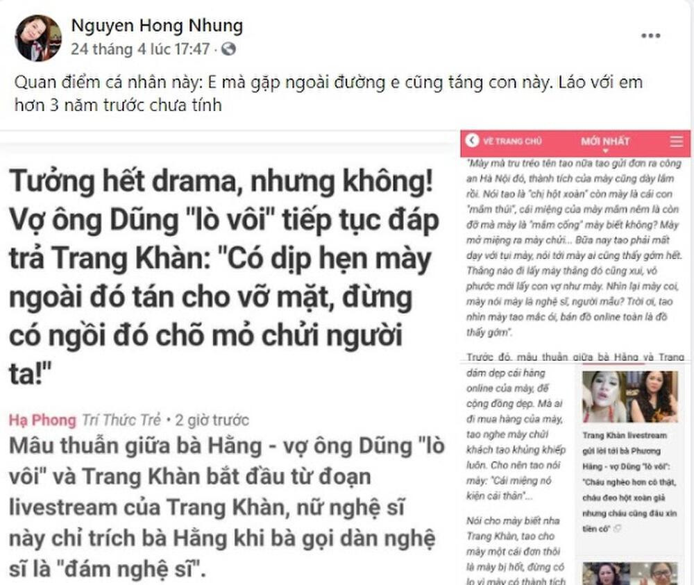 Sự việc tiếp tục "leo thang" khi trong ngày 24/4 vừa qua, chị Nguyễn Hồng Nhung - vợ của nghệ sĩ Xuân Bắc đăng đàn cảnh cáo Trang Trần: “Quan điểm cá nhân này: Em mà gặp ngoài đường em cũng táng con này. Láo với em hơn 3 năm trước chưa tính”. Kèm theo đó là link bài viết với nội dung bà Nguyễn Phương Hằng tuyên bố sẽ "táng vỡ mặt" Trang Trần.