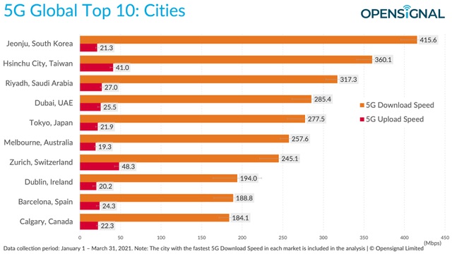 Mới đây, Open Signal, công ty chuyên phân tích và đánh giá về thị trường mạng di động và không dây (có trụ sở tại London, Anh), vừa công bố báo cáo về tốc độ mạng 5G trên toàn cầu trong quý I/2021.Theo báo cáo của Open Signal, 5/10 thành phố có tốc độ mạng 5G nhanh nhất thế giới nằm ở châu Á và chiếm trọn 5 vị trí dẫn đầu. Trong đó, Jeonju, thành phố lớn thứ 16 tại Hàn Quốc, là thành phố có tốc độ mạng 5G nhanh nhất thế giới, khi người dân sống ở đây có thể đạt được tốc độ tải trung bình lên đến 415,6 Mbps (51,95 MB/s), nhanh gấp 15% tốc độ mạng 5G trung bình tại Hàn Quốc.