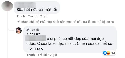 Ngay lập tức Trang Trần phản ứng lại với b́nh luận: "Phải có nét đẹp sửa mới đẹp được. Chị (người b́nh luận - pv) sửa là không đẹp nhé chị. Chị nên sửa cái nết soi mói nhé chị". Chính điều này đă khiến cho không ít người bất ngờ.