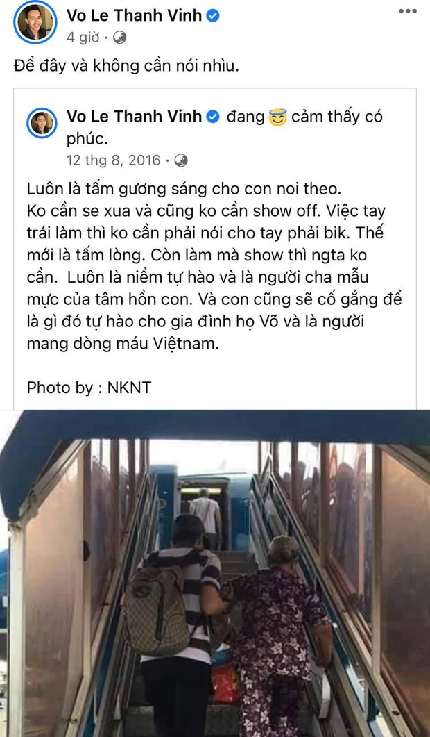 Sáng sớm ngày 13/5, Thành Vinh đã chia sẻ lại hình ảnh bố ân cần đưa 1 người lớn tuổi lên máy bay và có tâm thư khen ngợi nhân cách của NS Hoài Linh: "Luôn là tấm gương sáng cho con noi theo. Không cần se sua và cũng không cần thể hiện.