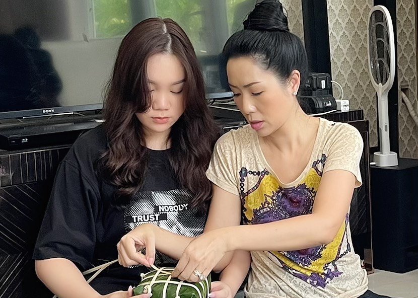 Trịnh Kim Chi hướng dẫn con gái gói bánh chưng.