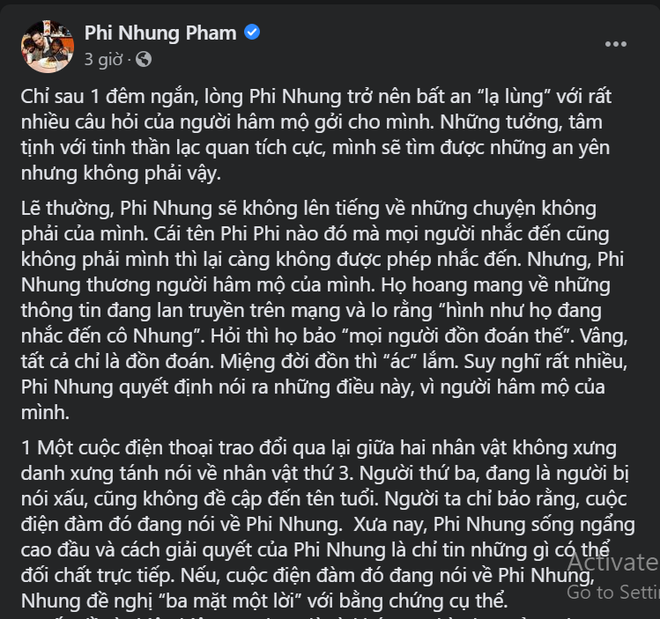 Lẽ thường, Phi Nhung sẽ không lên tiếng về những chuyện không phải của mình. Cái tên Phi Phi nào đó mà mọi người nhắc đến cũng không phải mình thì lại càng không được phép nhắc đến. Nhưng, Phi Nhung thương người hâm mộ của mình.