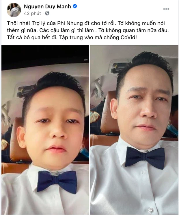 Cho đến tối ngày 8/6, Duy Mạnh cũng bất ngờ đăng đàn thông báo diễn biến vụ drama với Phi Nhung. Tưởng đáp trả căng đét ai ngờ Duy Mạnh đã tuyên bố ngừng chiến vì phía Phi Nhung vừa gọi điện, nam ca sĩ chia sẻ: "Thôi nhé, trợ lý Phi Nhung điện thoại cho tớ rồi. Tớ không muốn nói thêm gì nữa, các cậu làm gì thì làm. Tớ không quan tâm nữa đâu, bỏ qua hết đi. Tập trung vào chống Covid!".