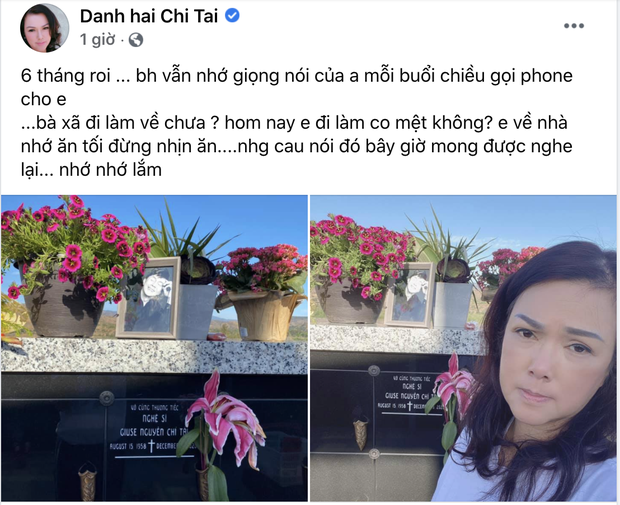 Sáng ngày 9/6, vợ của cố NS Chí Tài lại đến thăm mộ chồng như thường lệ. Cô chia sẻ dòng trạng thái khiến người hâm mộ không khỏi bùi ngùi, xúc động: "6 tháng rồi, bây giờ vẫn nhớ giọng nói của anh mỗi buổi chiều gọi phone cho em. Bà xã đi làm về chưa? Hôm nay em đi làm có mệt không? Em về nhà nhớ ăn tối đừng nhịn ăn... Những câu nói đó bây giờ mong được nghe lại... Nhớ nhớ lắm". Đứng trước mộ chồng, gương mặt nữ ca sĩ đượm buồn, đôi mắt sưng húp khiến ai nhìn cũng xót xa.