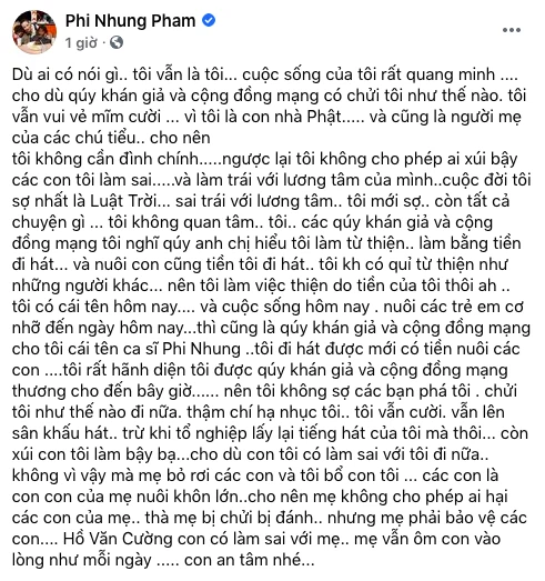 Tôi có cái tên, cuộc sống và nuôi các trẻ em cơ nhỡ đến ngày hôm nay thì cũng là quý khán giả và cộng đồng mạng cho tôi cái tên ca sĩ Phi Nhung.