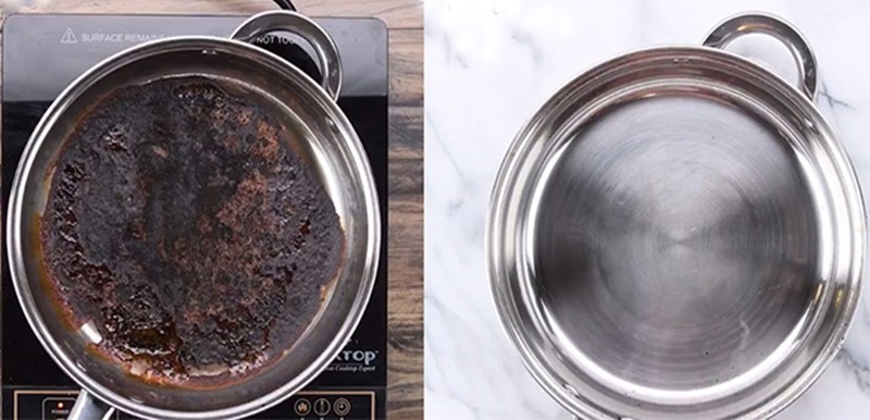Loại bỏ vết bẩn và vệt cháy đen trên nồi kim loại bằng cách đun sôi hỗn hợp gồm 1 chén dấm trắng và một cốc nước nóng.