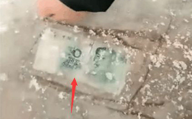 Ban đầu khi mới nhìn qua, anh đã nghĩ rằng đó là một tờ tiền mệnh giá 50 tệ. Sau một hồi cân nhắc, người đàn ông đã quyết định phá băng để lấy tiền.