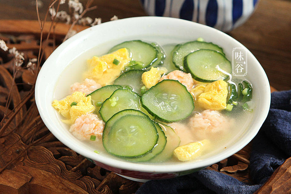 - Phi thơm hành lá gừng, thêm nước sôi, vo viên tôm cho vào, đợi nước sôi thì thêm trứng và dưa chuột, nấu khoảng 3 phút, rắc một chút muối, nêm nếm lại gia vị.