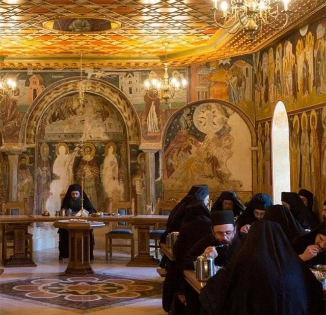 Các tu sĩ núi Athos nghe kinh cầu nguyện ngay cả trong lúc dùng bữa, quy tắc ở đây là phải giữ im lặng tuyệt đối khi ăn uống. Thức ăn chủ yếu của họ là rau, cá và rượu vang. Đây đều là những thứ được nuôi trồng trong trang trại của tu viện, họ thậm chí còn trồng cả nho để tự làm rượu vang.