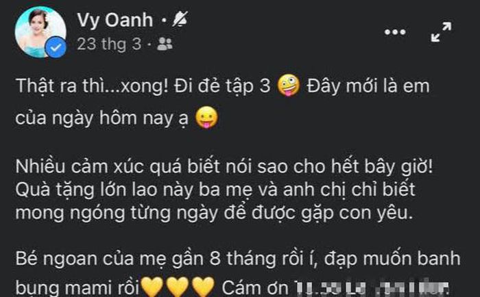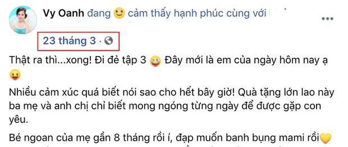 Mới nhất, nhiều cư dân mạng đã vô cùng bất ngờ với thông báo đi đẻ của Vy Oanh. Theo đó, nữ ca sĩ từng đăng tải mang thai được 8 tháng khi tháng 3 dương lịch. Nhưng mãi sang tận giữa tháng 7 mới chịu đi đẻ.