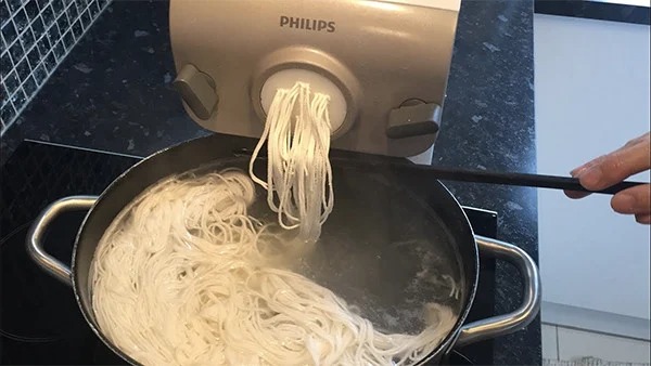 - Đun sôi nồi nước cùng với ½ thìa cà phê dầu ăn. Đun đến khi nước trong nồi bắt đầu sôi thì bạn cho khối bột vào khuôn ép bún và nhanh chóng ép chặt tay để bún chảy vào trong nồi nước sôi.