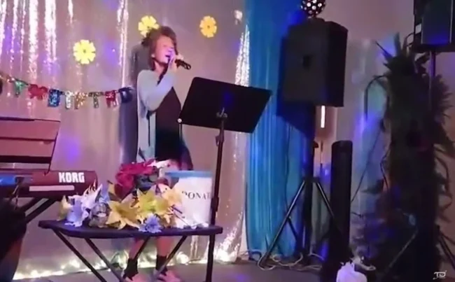 Hình ảnh ca sĩ Kim Ngân trình diễn trước khán giả sau hơn 20 năm hoá điên. Ảnh chụp từ clip