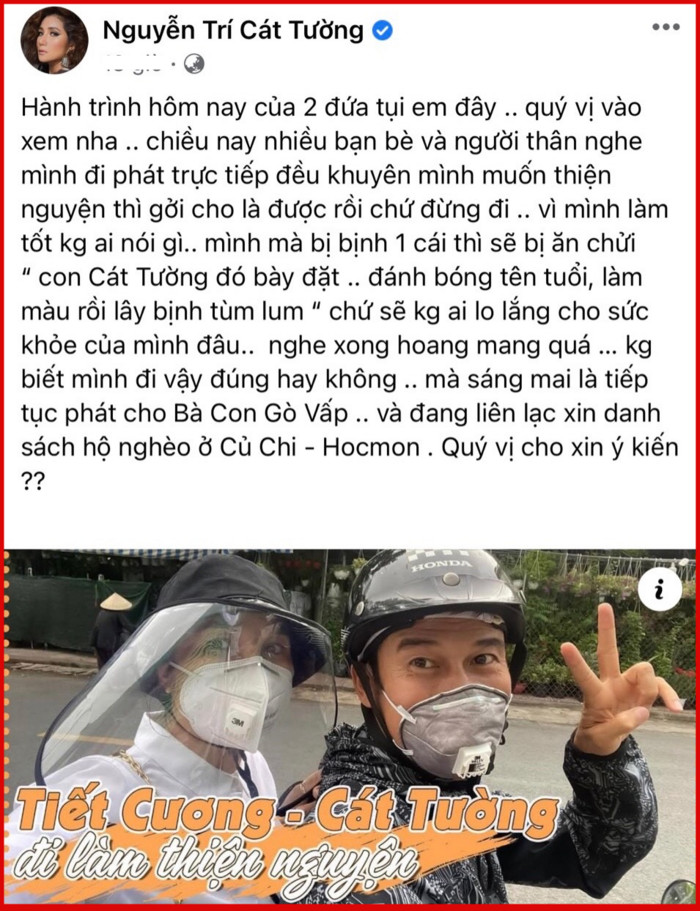 Mới đây, nghệ sĩ Cát Tường có những chia sẻ về vấn đề làm từ thiện trong mùa dịch. Theo đó, cô tâm sự thường xuyên nhận được những câu hỏi trách móc sao không làm từ thiện giống những nghệ sĩ khác. Chưa dừng lại ở đó, khi nữ MC chia sẻ những khoảnh khắc hạnh phúc bên gia đình cũng bị nói "mùa dịch đăng tào lao".