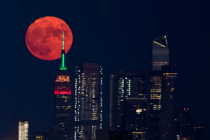 Thông thường, Mặt Trăng chuyển sang màu da cam hoặc đỏ trong thời gian nhật thực, khi Trái Đất che khuất ánh sáng chiếu tới từ Mặt Trời. Khi đó, bầu khí quyển của Trái Đất khúc xạ ánh sáng màu đỏ lên bề mặt của Mặt Trăng, tạo ra hiện tượng trăng máu. Trong ảnh, Mặt Trăng được quan sát có màu cam từ Ontario, Canada. Ảnh: Reuters.