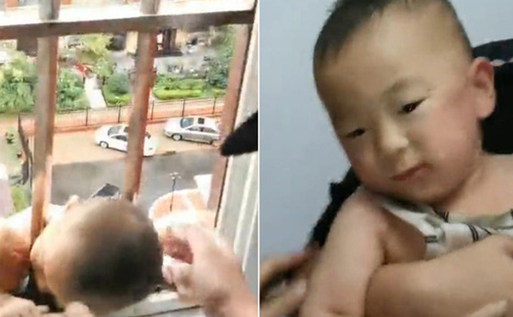 May mắn thay, đầu em bé đã kẹt vào khe cửa khiến cho bé không bị rơi xuống đất, nhưng cứ lơ lửng ở ban công như vậy một lúc khá lâu.