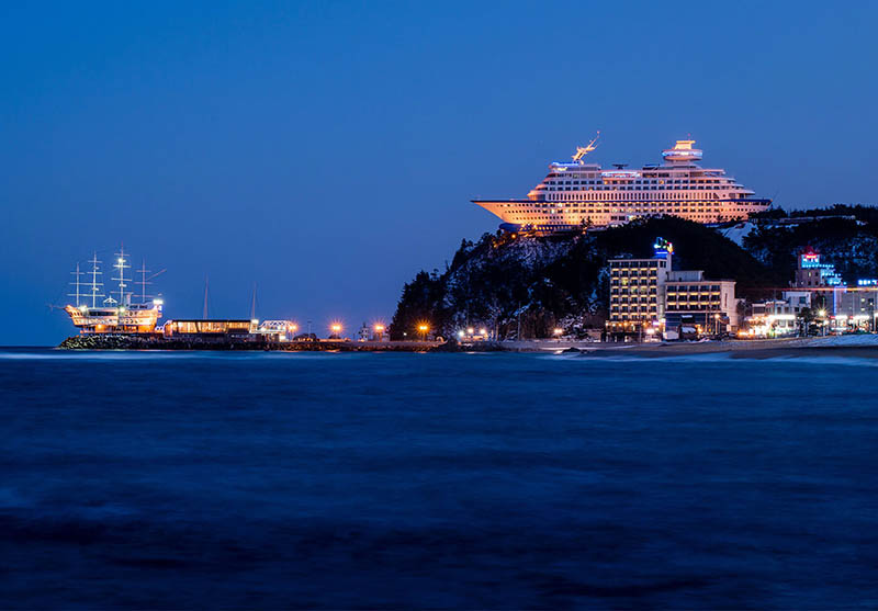 Sun Cruise Resort là một con tàu du lịch lớn, nằm trên đỉnh núi Jeongdongjin, Hàn Quốc. Thực ra, đây là một khách sạn sang trọng, nổi tiếng bậc nhất châu Á. Nó là một con tàu được trang bị đầy đủ tiện nghi, có cabin và cửa sổ nhìn ra toàn cảnh vịnh Donghe.