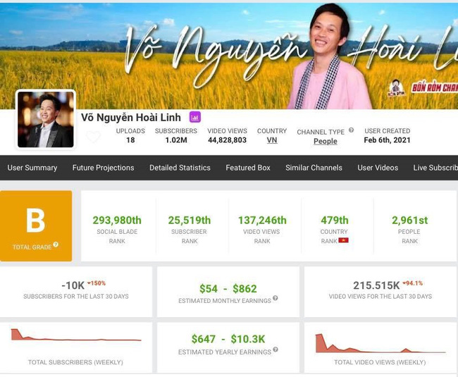 Số liệu về kênh Youtube của Hoài Linh theo thống kê của Socialblade