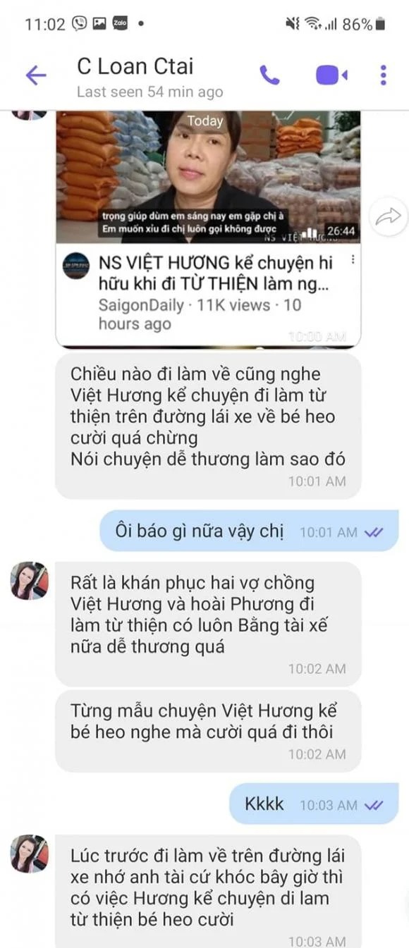 Phương Loan ngưỡng mộ hành động đẹp của hai vợ chồng và còn tiết lộ rất thích nghe giọng Việt Hương chia sẻ trên livestream. "Chiều nào đi làm về cũng nghe Việt Hương kể chuyện đi làm từ thiện. Trên đường lái xe về bé Heo (Phương Loan) cười quá chừng. Nói chuyện dễ thương làm sao đó. Rất thán phục hai vợ chồng Việt Hương và Hoài Phương đi làm từ thiện. Từng câu chuyện Việt Hương kể bé Heo nghe mà cười quá đi thôi", nữ ca sĩ Phương Loan nhắn đến Việt Hương.