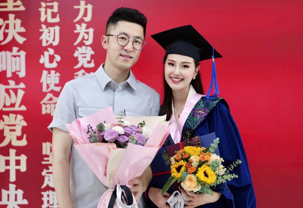 Lê Thị Thương chụp ảnh cùng ông xã Hạ Dĩ Dương trong ngày cô tốt nghiệp thạc sĩ ở Thượng Hải.