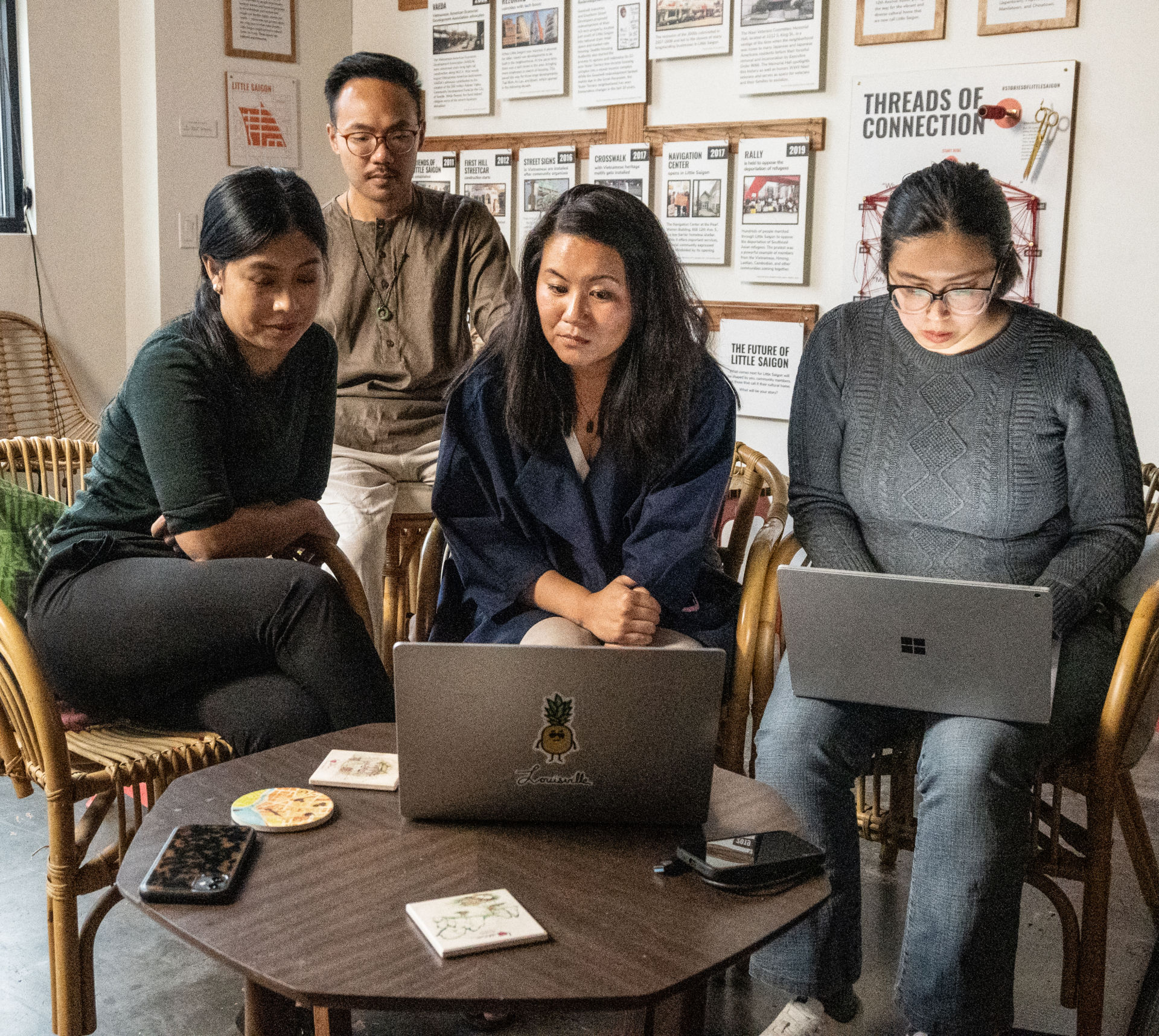 Nhóm thiện nguyện viên của cô Thanh Tân. Từ trái: Bảo-Trâm Đỗ, Jefferey Vũ, Thanh Tân, Dede Trần. (Hình: Whitney Rearick)